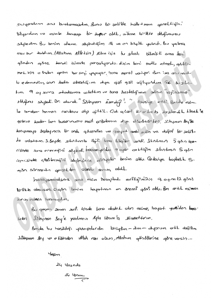Süleyman hocam biz mutluluğumuzu size borçluyuz, bize yeniden gülmeyi mutlu olmayı öğrettiniz. Süleyman hocama Ayla hanıma, hep yanımda olup destek olduğu için eşime de sonsuz teşekkür ediyorum. Allah sizden razı olsun. Allahım başarılarınızı daim etsin, şuan bu mektubu her kim okuyorsa unutmayın ki bir gün sizin yerinizde ben oturuyordum ve o mektupları ben okuyordum. Ben başardım sizde başara bilirsiniz. Kendinizi Süleyman hocamın o şifalı ellerine bırakın, ona güvenin zaten sonrası gelir. Unutmayın ben başardımsa herkes başarabilir. Lütfen kendinizi daha fazla harap etmeyin. Vajinismus kaderiniz olmasın, iyi ki karşıma çıktınız Süleyman bey, sizi çok seviyorum. Mız mız hastanız artık ağlamıyor.